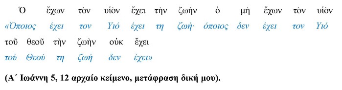 «Και αυτή είναι η μαρτυρία: ότι ο Θεός έδωσε σ’ εμάς ζωή αιώνια, και αυτή η ζωή είναι μέσα στον Υιό του (Α΄ Ιωάννη 5, 11 μετάφραση Καραλή).
