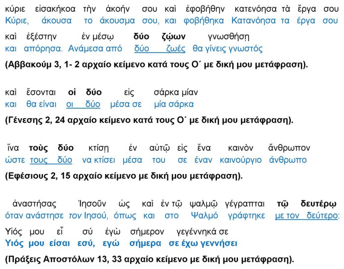 Το πρωτότυπο κείμενο της προς Εβραίους επιστολής 1, 5 επιβεβαιώνει αυτή την έννοια, αλλά όχι στη δική σας μετάφραση. Αυτό συμβαίνει επειδή στη δική σας μετάφραση έχουν παραλείψει τη πρόθεση εἰς (εις = «μέσα σε»). Ως εκ τούτου, η οριστική αντωνυμία «αὐτοὶ» δεν εννοεί τον λαό αλλά τους Θεούς (= לֵֽאלֹהִ֔ים) που είναι ο Υιός. Διότι το εβραϊκό κείμενο φέρει στο συγκεκριμένο σημείο τον πληθυντικό «Θεούς». Ως εκ τούτου, η προφητεία αναφέρει ξεκάθαρα στο εδάφιο 11 ότι πρέπει να σου έχει δοθεί, ώστε να γνωρίζεις τον Κύριο. Διότι τότε θα γνωρίζεις επίσης γιατί αναφέρεται ο Υιός του Θεού στον πληθυντικό ή ως «οι δύο».