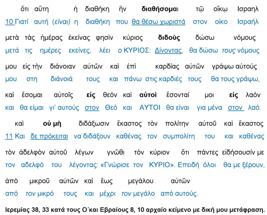 Επομένως, η Καινή Διαθήκη είναι η αναβάθμιση (=Upgrade*) της λεγόμενης παλαιάς (=Τορά) που στηρίζεται βέβαια στους Νόμους, αλλά αλλάζει τον καθοδηγητή του πιστού. Δηλαδή, ο πιστός δεν εκτελεί πλέον το νόμο μέσω της αμαρτίας (πρβ. Προς Ρωμαίους 7, 19-20), αλλά καθοδηγήται από τον Υιό του Θεού. Από την προφητεία αφαιρέθηκε από τις μεταφράσεις του κόσμου δύο φορές η πρόθεση «εἰς», επειδή διακρίνει τον Κύριο από το Θεό, δηλαδή, τον Πατέρα από τον Υιό.