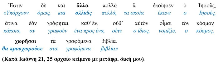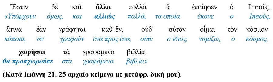 Το συγκεκριμένο εδάφιο μεταφράζεται από το θρησκευτικό σύστημα με την έννοια ότι ο κόσμος δεν θα χωρούσε το πλήθος των βιβλίων που θα γράφονταν. Έλα όμως, που κατάλαβαν ότι το παράλογο αυτό νόημα δεν συμπίπτει με τον τρόπο σκέψης γραψίματος του Ευαγγελιστή Ιωάννη. Έτσι λοιπόν, το θρησκευτικό σύστημα άρχισε να διαδίδει ότι δήθεν αυτό το εδάφιο το είχε γράψει κάποιος μαθητής τού Ιωάννη κι όχι ο ίδιος. Το πραγματικό νόημα που ήθελε να καλύψει ο σατανάς μέσω των διδασκάλων, είναι ότι ο ίδιος ο παρόντας κόσμος δεν θα συμπεριλαμβάνονταν μέσα στα γραφόμενα βιβλία. Που σημαίνει, ότι ο Ιησούς δεν είχε καμία ανάμιξη στην κατάντια αυτού του κόσμου. Δεν εννοώ ότι ο Ιησούς δεν συμμετείχε στη δημιουργία αυτού του κόσμου, αλλά ότι δεν έχει καμία ανάμιξη στην εξέλιξη του. Το κλειδί για την πραγματική έννοια είναι το «ἄλλα» και το ρήμα «χωρῆσαι». Το «χωρῆσαι λοιπόν, αναφέρεται και στην δεύτερη επιστολή τού Απόστολου Πέτρου 3, 9. Εκεί  γιατί το θρησκευτικό σύστημα μεταφράζει «προσχωρώ», ενώ στο εδάφιο του Ιωάννη το διαστρεβλώνει; Όσο αφορά το «ἄλλα» σημαίνει «αλλιώς» του ίδιου είδους. Υπονοείται λοιπόν, ότι υπάρχει ένας κόσμος αλλιώς, τον οποίο έκανε ο Ιησούς. Ενώ ο παρόντας κόσμος, επειδή είναι έργο του πονηρού, γι’ αυτό και δεν θα προσχωρούσε στα γραφόμενα βιβλία. Αγαπητοί αναγνώστες, από τον πρώιμο χριστιανισμό είχαν αρχίσει να διαστρεβλώνουν τις έννοιες του Ευαγγελίου, όπως το δήλωσε και ο ίδιος απόστολος Παύλος: