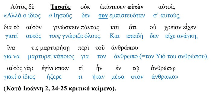 Αυτό το απόσπασμα αναφέρεται στον Υιό του ανθρώπου κατά τη στιγμή της εορτής, κι όχι στους πολλούς ανθρώπους και ούτε καν στον άνθρωπο Ιησού. Γιατί ο άνθρωπος Ιησούς ήταν προορισμένος στους ανθρώπους για θυσία. Το άναρθρο όνομα Ιησούς προσδιορίζει και πάλι το Πνεύμα του Υιού που έβλεπε το δεύτερο του «εγώ» στον Υιό του ανθρώπου (= ψυχή του Πνεύματος). Το Πνεύμα δεν χρειαζόταν τη μαρτυρία άλλων ανθρώπων, γιατί το Πνεύμα ήξερε καλύτερα τον Υιό του ανθρώπου, επειδή ήταν η ψυχή Του: