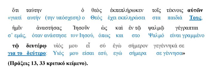 Αγαπητοί αναγνώστες, πρέπει να ξέρετε ότι τον 1ο αιώνα, όταν κατέγραφε ο Ευαγγελιστής Λουκάς τις πράξεις των Αποστόλων, δεν υπήρχαν αριθμοί κεφαλαίων. Η διαίρεση της Βίβλου σε κεφάλαια έγινε τον 13ο αιώνα από τον άγγλο θεολόγο Stephen Langton. Επομένως, η διατύπωση «τῷ δευτέρῳ» δεν έχει καμία σχέση με το κεφάλαιο του ψαλμού, αλλά για το δεύτερο κομμάτι του διαιρεμένου Πνεύματος. Επομένως, ο Ευαγγελιστής Λουκά επιβεβαιώνει ότι υπάρχει ένα δεύτερο Εγώ του Υιού του Θεού. Ως εκ τούτου, το αρχαίο κείμενο της Αποκάλυψης 11, 15 αναφέρει ξεκάθαρα στον ενικό «βασιλεία» και «θα βασιλεύσει», αν και αφορά δύο πρόσωπα, τον Κύριο και τον Χριστό του. Αυτό μπορεί να εξηγηθεί μόνο αν υπάρχει ένα διαιρεμένο Πνεύμα που σχηματίζει τον Υιό του Θεού και τον Υιό του ανθρώπου:
