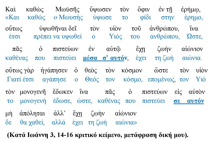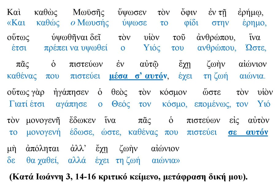 Το απόσπασμα αυτό παραπέμπει στα αναφερόμενα του βιβλίου των Αριθμών 21, 9. Ο εβραϊκός λαός, λοιπόν, απιστούσε για άλλη μια φορά στον Υιό του Θεού, κι ως κριτής του κόσμου έστειλε ο Υιός τα φαρμακερά φίδια για τιμωρία (πρβ. Α΄ Κορινθίους 10, 9). Έπειτα όμως, αφού παρακάλεσε ο Μωυσή να συγχωρέσει ο Θεός το λαό, του διετάχθη να φτιάξει ο Μωυσή ένα χάλκινο φίδι και να το κρεμάσει πάνω σε ένα ξύλινο κοντάρι. Έτσι ώστε, ο καθένας που δαγκωνόταν από ένα φαρμακερό φίδι, να κοιτά έπειτα πάνω στο κρεμασμένο χάλκινο φίδι και να γιατρεύεται. Δηλαδή, αυτός που είχε δαγκωθεί από φίδι έβλεπε στο χάλκινο φίδι τη κατάρα που του επιβληθεί, ώστε με πίστη στο Θεό θα απαλλάσσονταν από τη κατάρα του θανάτου. Ο Ευαγγελιστής Ιωάννης λοιπόν, συνδύασε το συμβάν με το χάλκινο φίδι και αυτό με τον σταυρωμένο άνθρωπο Ιησού. Δηλαδή, ο καθένας θα έπρεπε να βλέπει στο πρόσωπο του ανθρώπου Ιησού την κατάρα της ανθρώπινης φύσης του, όπως με το χάλκινο φίδι (πρβ. Γαλάτες 3, 13). Ώστε πιστεύοντας μέσα στον Υιό του ανθρώπου, όπου βρίσκεται το Πνεύμα ζωής του μονογενή Υιού του Θεού, θα απαλλάσσεται ο πιστός από την κατάρα τού θανάτου. Μόνο έτσι θα μπορέσει κανείς να ντυθεί τον νέο εσωτερικό αιώνιο άνθρωπο. Η κατάρα που εκφραστικέ από το Θεό μέσα στον παράδεισο ενάντια στην ανθρώπινη φύση δεν αναιρέθηκε πότε και είναι ισχύουσα μέχρι σήμερα (πρβ. Γένεσις 3, 17-19). Γι’ αυτό δόθηκε ο νόμος, για να μπορεί ο άνθρωπος να γνωρίσει ότι καθοδηγείται από το σώμα (ή πνεύμα) της αμαρτίας (πρβ. Ρωμαίους 7, 7 και 6, 6). Επομένως, στη συνέχεα θα καταλάβαινε ο καθένας ότι, για να μπορέσει να σωθεί θα έπρεπε να αναγεννηθεί μέσα στο σώμα (ή Πνεύμα) της Αλήθειας (πρβ. Κατά Ιωάννη 3, 3):