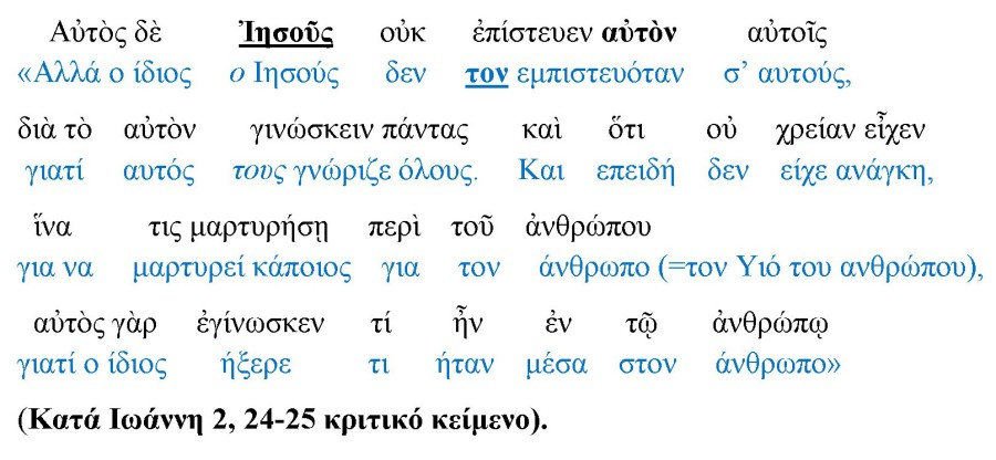«Αλλά, και στο νόμο το δικό σας είναι γραμμένο ότι η μαρτυρία δύο ανθρώπων είναι αληθινή. Εγώ είμαι αυτός που μαρτυρεί για τον εαυτό μου, επίσης μαρτυρεί για το δικό μου ο Πατέρας που με έστειλε». Έλεγαν λοιπόν σ’ αυτόν: «Πού είναι ο Πατέρας σου;» Απάντησε ο Ιησούς: «Ούτε εμένα ξέρετε ούτε τον Πατέρα μου. Αν εμένα ξέρατε, και τον Πατέρα μου θα ξέρατε» (Κατά Ιωάννη 8, 17-19 μετάφραση δική μου).