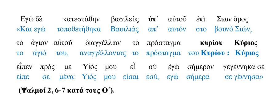 Από την Επιστολή προς Εβραίων 1, 5 και 5, 5 μπορεί να υποτεθεί ότι ο ομιλητής στο απόσπασμα του Ψαλμού δεν είναι άλλος από τον Υιό του ανθρώπου που ενθρονίσθηκε  βασιλιάς (πρβ. Αποκάλυψις 11, 15). Σημειώστε, ωστόσο, ότι όχι μόνο ο ομιλητής επιβεβαιώνεται ως Υιός, αλλά και ο Κύριος. Αυτό διακρίνεται επειδή ο ομιλητής παραθέτει το πρόσταγμα του Κυρίου. Έτσι αποδεικνύεται ο δυϊσμός του Υιού του Θεού, ο οποίος είναι ο ομιλητής και ο Κύριος του προστάγματος. Αυτό το νόημα δεν πραγματοποιείται στο εβραϊκό κείμενο, καθώς ο Ιουδαϊσμός αφαίρεσε ένα από τα δύο ονόματα «Κύριος», έτσι ώστε να αποκρύπτεται ότι πρόκειται και για παράθεση (=αυτολεξεί επανάληψη κειμένου). Ο Ευαγγελιστής Λουκάς, λοιπόν, αναφερόμενος στο συγκεκριμένο ψαλμό, κάνει μια ενδιαφέρουσα δήλωση που επιβεβαιώνει τους ισχυρισμούς μου: