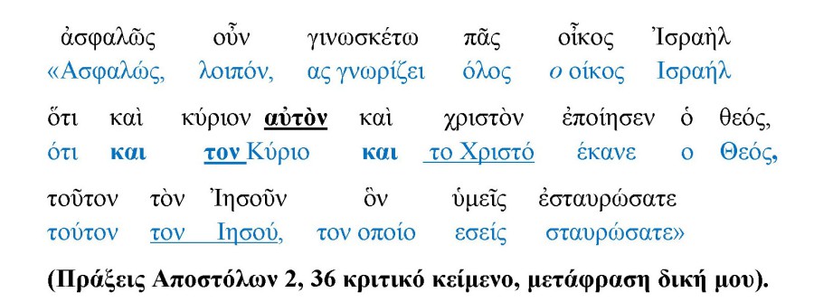 Ως μια ένδειξη αυθεντικότητας αυτής της μετάφρασης είναι το εκκλησιαστικό κείμενο, το οποίο από το κριτικό κείμενο φέρει διαφορετική διάταξη στην οριστική αντωνυμία αὐτὸν. Η Οριστική αντωνυμία αὐτόν χρησιμοποιείται για να ορίσει κάτι (να το ξεχωρίσει από άλλα), Οι μεταφράσεις παγκόσμιος, όμως, καταλήγουν όλες σε ένα και το ίδιο νόημα, ανεξάρτητα ποιο αρχαίο κείμενο παίρνουν ως βάση. Δηλαδή, μεταφράζουν ότι ο Θεός έκανε τον άνθρωπο Ιησού Κύριο και Χριστό. Αλλά το κριτικό κείμενο διακρίνει τον Κύριο (=τον Υιό τού Θεού) από το Χριστό (= τον Υιό του ανθρώπου) και τον άνθρωπο Ιησού (= η βάση). Ο λόγος που απαρνείται ο λεγόμενος χριστιανισμός το δυαδισμό, μεταξύ του Υιού του Θεού και του Υιού του ανθρώπου, και μεταξύ του Υιού του ανθρώπου και του ανθρώπου Ιησού, είναι ειδωλολατρικός. Γιατί ο λεγόμενος χριστιανισμός δεν μπορεί πλέον αλλιώς να πράξει,  αρέσκεται να δοξάζει τον άνθρωπο Ιησού ως Υιό του Θεού:
