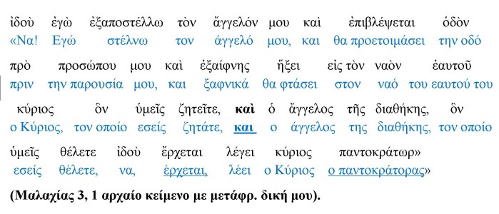 Επειδή το θρησκευτικό σύστημα θέλει να ταυτίζει τον άνθρωπο Ιησού με τον Υιό του Θεού, αρνείται ότι αυτή η προφητεία ανακοίνωσε τον ερχομό τριών προσώπων. Ενώ ο ομιλητής είναι ο παντοκράτορας Κύριος, διακρίνει τον εαυτόν Του από έναν δεύτερο Κύριο που πρόκειται να φτάσει στον Ναό του. Διακρίνονται επίσης και δύο άγγελοι, ο πρώτος που αναφέρεται ήταν ο Ιωάννης, ο αποκαλούμενος πρόδρομος ή Βαπτιστής∙ τον δεύτερο άγγελο, τον ονομάζει η Αγία Γραφή «άγγελο της διαθήκης». Με την ονομασία αυτή, εννοείται αναμφισβήτητα ο άνθρωπος Ιησούς. Η προφητεία του Μαλαχία αναφέρεται σε τρία πρόσωπα που αναμένονταν, αλλά οι Φαρισαίοι όπως και οι λεγόμενοι χριστιανοί αποδέχονται δύο πρόσωπα. Οι μόνοι που διέκριναν από αυτήν την προφητεία τρία πρόσωπα ήταν οι Εσσαίοι (μια αρχαία ιουδαϊκή αίρεση). Τούτο αποδεικνύεται από τα περίφημα χειρόγραφα τους που ανακαλύφθηκαν στο Κουμράν της Νεκρά Θάλασσας το 1948. Κάποια από αυτά κατέγραφαν ξεκάθαρα ότι περίμεναν τον ερχομό δύο Χριστών (1QS 9,10). Σύμφωνα με την προφητεία του Μαλαχία, πρόκειται για τον άγγελο της διαθήκης και τον Κύριο (= ο Υιός του Θεού). ο οποίος είχε εισέλθει μέσα στον άνθρωπο Ιησού. Διότι ο Υιός του Θεού, επειδή είναι Θεός, δεν θα μπορούσε κανείς να τον δει, επομένως, έπρεπε να εισέλθει σε ένα σκεύος, για να μπορεί μέσω αυτού του σκεύους να διδάσκει και να πράττει θαύματα στα σκεύη. Αυτό το γεγονός διακρίνεται στην προφητεία του Μαλαχία από την τελευταία φράση. Γιατί ενώ η προφητεία δηλώνει τον ερχομό των δύο τελευταίων προσώπων, τον Κύριο και τον άγγελο της διαθήκης, γράφει στον ενικό «έρχεται» κι όχι «έρχονται», επειδή οι δύο θα ήταν σε ένα σκεύος. Και αυτό ακριβώς υπονοεί το ακόλουθο απόσπασμα: