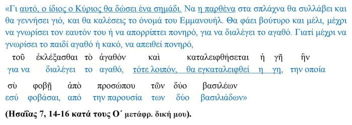 Δεδομένου ότι η προφητεία του Σαμουήλ υπονοούσε μια υπερφυσική σύλληψη, οι θεόπνευστοι μεταφραστές των εβδομήκοντα αποφάσισαν στην προφητεία του Ησαΐα να ερμηνεύσουν την εβραϊκή λέξη «αλμάχ», ως «παρθένα». Αν και στην κυριολεξία σημαίνει «νεαρό κορίτσι». Γιατί ποια άλλη λέξη θα μπορούσε να υποδείξει μια υπερφυσική σύλληψη, αν όχι η λέξη «παρθένα»; Ως εκ τούτου, η τελευταία φράση στο εβραϊκό κείμενο έχει διαστρεβλωθεί, για να θολώσει το τοπίο. Επειδή οι περισσότεροι άνθρωποι δεν γνωρίζουν ότι η προφητεία του Ησαΐα δεν σχετίζεται άμεσα αλλά έμμεσα με τη γέννηση του Ιησού, θα εξηγήσω το γεγονός. Δηλαδή, ο Άχαζ ήταν ένας δειλός βασιλιάς που φοβόταν ότι οι δύο βασιλείς (Ρεσίν και Φεκάχ) θα ερήμωναν τη χώρα. Γι’ αυτό ο Θεός καθησύχασε τον Άχαζ μέσω του προφήτη Ησαΐα: Ότι η χώρα δεν θα ερημωθεί από τους δύο αυτούς βασιλιάδες Ρεσίν και Φεκάχ, αλλά θα ερημώνονταν όταν θα συνέβαινε το σημείο της παρθενογένεσης. Και πράγματι οι Ρεσίν και Φεκάχ νικήθηκαν από τον Άχαζ. Έτσι λοιπόν, άρχισε με αυτό το γεγονός να εκπληρώνεται η προφητεία του Ησαΐα. Ακολούθως 500 χρόνια αργότερα εκπληρώθηκε πλήρως η προφητεία, αφού 70 χρόνια μετά τον θάνατο του ανθρώπου Ιησού καταστράφηκε η γη Ισραήλ από τους Ρωμαίους κι εγκαταλείφτηκε. Και τώρα ας δούμε τι πραγματικά αναφέρει το αρχαίο κείμενο της Αγίας Γραφής για τη γέννηση του Ιησού: