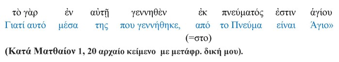 Αυτό το νόημα, αγαπητοί αναγνώστες, είναι αυτό που δημιουργεί τη μεγάλη αντίφαση, γιατί τότε δεν θα μπορούσε να είναι ο γιός του Δαυίδ, αφού θα ήταν ο Γιός του Πνεύματος. Επίσης θεωρώ βλασφημία να αναφέρει κανείς ότι το Πνεύμα του Θεού είναι ο πατέρας του ανθρώπου Ιησού. Διότι στην επιστολή προς Ρωμαίους 8, 3 και Β΄ Κορινθίους 5, 21 ο άνθρωπος Ιησούς αναφέρεται ως αμαρτία. Το εδάφιο λοιπόν, δεν αναφέρει ποιόν πατέρα τυγχάνει να έχει το παιδί, αλλά υπονοεί δύο όντα. Σύμφωνα με την Αγία Γραφή υπάρχουν δύο ειδών σώματα, το ψυχικό και το πνευματικό: