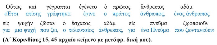 Σε αυτό το εδάφιο αναφέρει το αρχαίο κείμενο τη λέξη «άνθρωπος» μία φορά στα ελληνικά και δύο φορές στα εβραϊκά «αδάμ». Η λέξη αδάμ είναι η ελληνική περίφραση της εβραϊκή λέξεως «άνθρωπος», δεν εννοείται εδώ ως κύριο όνομα. Το εδάφιο διακρίνει δύο ειδών ανθρώπους, τον πρώτο άνθρωπο που κατευθύνεται από τις δυνάμεις της ψυχής, και τον τελευταίο άνθρωπο που κατευθύνεται από τις δυνάμεις του Πνεύματος. Δηλαδή, πρόκειται για τη δημιουργία του τελευταίου είδους ανθρώπου που πρέπει εδώ και τώρα να ντυθούμε κι εμείς. Ο Ιησούς το επιβεβαίωσε επίσης στον Νικόδημο (πρβ. Ιωάννης 3, 6). Αγαπητοί αναγνώστες, ο πνευματικός άνθρωπος δεν έχει καμία σχέση με τον ψυχικό φυσικό άνθρωπο. Αλλά επειδή το θρησκευτικό σύστημα έχει εξελιχθεί, άρχισε να πουλάει την ψευδαίσθηση της αναγέννησης στους ψυχικούς ανθρώπους και όλοι τώρα πιστεύουν ότι είναι πνευματικοί άνθρωποι. Αυτοί οι άνθρωποι κοροϊδεύουν τον εαυτό τους, γιατί αν ήταν πράγματι πνευματικοί άνθρωποι, τότε θα ήταν με το Πνεύμα που τους ζωντανεύει. Αλλά αντίθετα, τρέχουν ακόμη σε εκκλησίες, ποίμνια και συναγωγές του θρησκευτικού συστήματος, που θα χαθεί μαζί με τους οπαδούς του (πρβ. Α΄ Κορινθίους 15, 47-49).