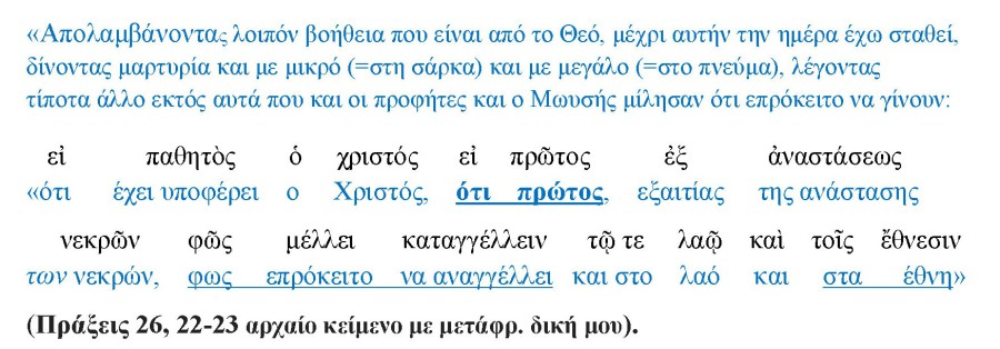 Οι περισσότερες μεταφράσεις διαστρεβλώνουν το παρόν απόσπασμα, ερμηνεύοντας ότι ο άνθρωπος Ιησούς θα ήταν ο πρώτος που θα αναστήνονταν από τους νεκρούς. Αλλά αυτό το νόημα αντιφάσκει κραυγαλέα με τα συμφραζόμενα της Αγίας Γραφής. Διότι πριν από τον άνθρωπο Ιησού είχαν αναστηθεί ο Λάζαρος (πρβ. Κατά Ιωάννη 11, 44), ένα κοριτσάκι (πρβ. Κατά Μάρκον 5, 42), και ένα αγόρι (πρβ. Γ΄ Βασίλειων 17, 21). Επομένως, το απόσπασμα σίγουρα δεν εννοεί ότι πρώτος θα αναστήνονταν ο Χριστός, αλλά πρώτος θα ανήγγελλε φώς στα έθνη. Ακριβώς αυτό το νόημα προφήτευσαν όλοι οι προφήτες για την δράση του Χριστού. Έλα, όμως, που ο άνθρωπος Ιησού συστηματικά απέφευγε τα έθνη, και απαγόρευε και τους μαθητές του, όσο ήταν μαζί τους, να κηρύττουν προς τα έθνη (πρβ. Κατά Ματθαίον 10, 5). Αφού λοιπόν ο άνθρωπος Ιησούς δεν ανήγγειλε τίποτε στα έθνη, τότε τίθεται το ερώτημα: Γιατί ο άνθρωπος Ιησούς αντιτάχθηκε σε όλες τις προφητείες, και δεν διακήρυξε φως στα έθνη; Αγαπητοί αναγνώστες, μέσω αυτών των αντιφάσεων μπορείτε να διακρίνεται ότι το απόσπασμα δεν εννοούσε μονάχα τον άνθρωπο Ιησού αλλά προπάντων τον Υιό του Θεού. Ο Υιός του Θεού που επέστρεψε στον παρόν νεκρό κόσμο είναι αυτός που απαγγέλνει φώς στα έθνη. Πρόκειται για την πρώτη ανάσταση των νεκρών, οι οποίοι είστε εσείς που τώρα διαβάζετε, και μπορείτε να ακούσετε τον Υιό του Θεού, ώστε να αναστηθείτε (πρβ. Κατά Ιωάννη 5, 25). Αγαπητοί αναγνώστες, όλες οι προφήτες για τον ερχομό του Χριστού δεν είχαν αναγγείλει μονάχα τον άνθρωπο Ιησού αλλά και τον Υιό του Θεού. Αυτό το αρνείται συστηματικά το θρησκευτικό σύστημα, για να παρουσιάζει τον άνθρωπο Ιησού ως Υιό του Θεού. Η ακόλουθη προφητεία υποδείχνει καθαρά τη διάκριση μεταξύ του Υιού του Θεού και του ανθρώπου Ιησού: