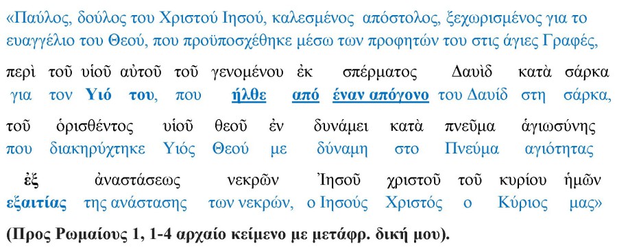 Σε αυτή την μετάφραση δεν μεταφράζεται η λέξη «σπέρματος» και προστέθηκε το «είναι» και το «ότι», επίσης έχει αλλαχτεί η σειρά των προτάσεων. Το θρησκευτικό σύστημα δεν τολμά να μεταφράσει τον όρο «σπέρμα» του αρχαίου κείμενου ως «απόγονο». Διότι τότε θα φαίνονταν τι αρνείται, ότι ο Χριστός (= ο Υιός του Θεού) θα έβγαινε από τον άνθρωπο Ιησού (=από τον απόγονο). Την ίδια έννοια έχει επίσης το ακόλουθο απόσπασμα: