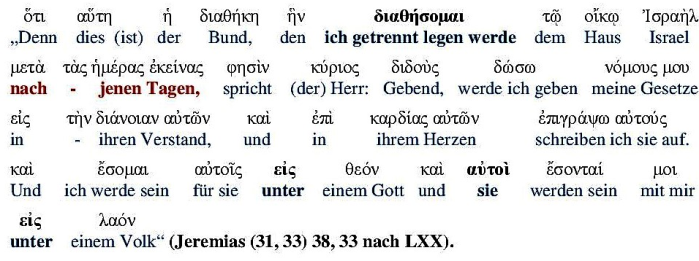 Liebe Leserinnen und Leser, Sie müssen akzeptieren, dass die Prophezeiung keinen irdischen Mittler außer Gott erwähnt. Ein Neues Testament macht einerseits das vorherige alt, andererseits ist es nicht da, um grundsätzlich das vorherige außer Kraft zu setzen. Dies wird auch angedeutet mit dem Wort διαθήσομαι (diathisome = „getrennt legen“). Daher ist das Neue Testament die Aktualisierung (=Upgrade*) des sogenannten Alten Testaments (= Tora), das wohl auf der Grundlage des Gesetzes steht, aber die Ausführmethode des Glaubenden verändert. Das heißt, ein Glaubender setzt nicht mehr das Gesetz durch die Sünde um (vgl. Römer 7, 19-20), sondern wird vom Sohn Gottes gelenkt indem, was er umsetzen soll. Beachten Sie auch bitte, dass die Prophezeiung weiterhin die Gesetze des Herrn auch im Neuen Testament bestätigt. Im letzten Satz der Prophezeiung sind aus den Übersetzungen zweimal die Präpositionen εἰς (eis = „unter“) entfernt worden, damit die Definition zwischen dem Herrn und Gott verborgen bleibt. Außerdem bezieht sich das Indikativ αὐτοὶ (avtoi = „sie“) nicht auf das Volk, sondern auf die Götter (= לֵֽאלֹהִ֔ים). Denn im hebräischen Text steht an der Stelle im Plural „Götter“ und im griechischen Text wird auf mehrere hingedeutet, da der bestimmte Artikel zum Wort „Gott“ nicht steht.