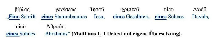 Die altgriechische Sprache hatte nur den bestimmten Artikel. Für irgendetwas Indefinitem gab es keinen unbestimmten Artikel, deshalb verwendete man lediglich die Nomina ohne Artikel. Das religiöse System führt in seinen Übersetzungen fälschlich auf diese vier unterstrichenen Positionen den bestimmten Artikel ein. Aber wie Sie selbst auch erkennen können, führt der Urtext keinen bestimmten Artikel mit sich. Also wäre es richtig gewesen, wenn in den Übersetzungen der unbestimmte Artikel stehen würde. Denn dann hätte jeder, der sich damit befasst, über „eine Schrift“ lesen können, was auf mehrere Schriften deutet und auch stimmt; es handelt sich nämlich um die Schriften der Evangelisten Markus, Lukas, Johannes. Dementsprechend hätte er auch entnehmen können über „eines Stammbaumes Jesu“, was erneut auf mehrere hindeutet, und auch erneut stimmt; nämlich auf den Stammbaum des Lukasevangeliums 3, 23. Darüber hinaus soll der Ausdruck „Jesus Christus“ nicht den Vor- und Nachnamen meinen, sondern sollte die Kombination aus dem Vornamen und dem Titel sein. Denn der Titel Christus ist die griechische Übersetzung des hebräischen Wortes masiach (=Mesias), was „gesalbter“ bedeutet. Da nun der Begriff Christus kein Eigenname ist, sondern ein Titel, müsste der unbestimmte Artikel „eines Gesalbten“ stehen, somit wird hier auch angedeutet, dass mehr als ein einziger Gesalbter gemeint ist.