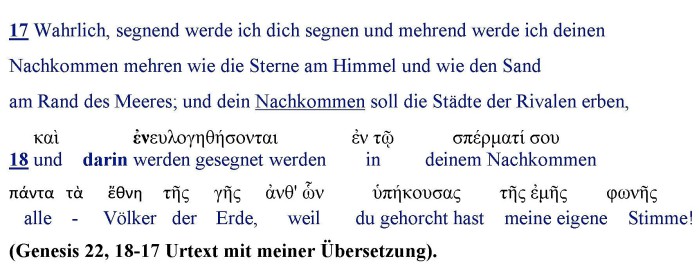 Zu Recht unterschied der Apostel Paulus zwischen zwei Bedeutungen im Singulären Wort „Samen“. Denn im 17. Vers wird klar, dass der Begriff „Nachkommen“ eine kollektive Bedeutung hat. Es versteht sich unter den Ausdrücken „wie die Sterne am Himmel“ und „wie den Sand des Meeres“. Das heißt, es sind die Juden gemeint, die gesegnet sind, weil sie nach dem Fleisch der Samen (=Nachkommen) Abrahams sind. Während der Begriff „Nachkommen“ im 18. Vers eine individuelle Bedeutung hat, es versteht sich unter dem Schlüsselwort „darin werden gesegnet werden“, nämlich, im Leben des Menschen Jesus. Denn die Juden und die Nationen sind zwei verschiedene Vertragsparteien, da konnte der Segen der Nationen nur in einem bestimmten Nachkommen gewesen sein. Demnach war der Mensch Jesus das Mittel zum Zweck, aus dem der Segen der Nationen hervorging, welcher Segen der Sohn Gottes ist (=das Leben) und nicht der Mensch Jesus. Das heißt, der Herr hat die Erschaffung eines neuen Lebens durch den toten Körper Jesu wiederholt, wie er es am Anfang mit dem leblosen Körper Adams tat (vgl. 1. Korinther 15, 45). Also hat er das immaterielle Wesen des Menschen neu erschaffen, damit aus einem neuen Wesen mehrere seines gleichen hervorkommen (vgl. Johannes 3, 5):