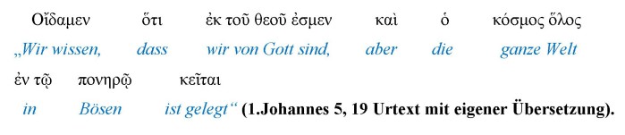 Das letzte Wort κεῖται (keitai = „gelegt“) wird in den Übersetzungen nicht wörtlich wiedergegeben. Es deutet nämlich an, dass der Herr dem Bösen diese Welt übergeben hat.
