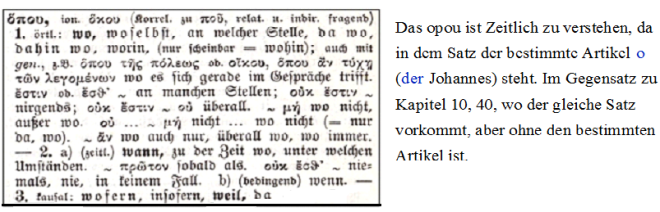 „Seit Origenes wurde Betanien mit Bethabara identifiziert, einer Jordanfurt in der Nähe der Taufstelle Jesu. Neuzeitliche Bibelatlanten zeichnen diesen Ort östlich des Jordans mit ein Fragezeichen in die Kartenwerke ein. Rudolf Bultmann fasst die Lage zusammen: "Die Versuche, ein Betanien ... östlich vom Jordan zu identifizieren, haben nicht zu einem sicheren Ergebnis geführt". Siegfried Schulz stellt lapidar fest: "Ein östlich des Jordan gelegenes Bethanien ist unbekannt"“ (Wikipedia).
