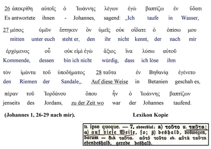 „Johannes antwortete ihnen und sprach: Ich taufe mit Wasser; mitten unter euch steht, den ihr nicht kennt, der nach mir kommt, vor den ich nicht würdig bin, den Riemen seiner Sandale zu lösen. Dies geschah in Betanien, jenseits des Jordan, wo Johannes taufte“