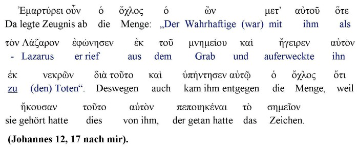 Die Juden bezeugen nicht nur, dass das Wunder der Wahrhaftige getan hatte, sondern sie wurden auch von ihm dazu geführt den Menschen Jesus entgegen zukommen. Deswegen verwies der Evangelist Johannes, sagend: „Auf diese Weise in Bethanien geschehe es“. Das heißt, der krasse Widerspruch mit der Lage Betaniens entstand, weil die Antichristen den Sohn Gottes verleugnen, deshalb haben sie all die Wunder dem Menschen Jesus angerechnet. Der Hauptgrund der Verleugnung dient einzig und allein dazu, den Geist des Sohnes als eine dritte Person darzustellen, damit der Herrscher dieser Welt (=Satan), der die Lüge repräsentiert, durch diese dritte nicht vorhandene Person sich von ihnen verherrlichen lassen kann: