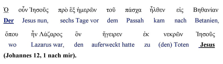 Im Urtext steht bei dem einen Namen der bestimmte Artikel „der Jesus“, damit ist der Mensch Jesus gemeint. Aber der ohne bestimmten Artikel aufgeführte Name, soll den Sohn Gottes meinen der Lazarus zu den geistig toten Menschen auferweckt hatte. Dass dies gemeint ist, kann jeder aus den Praktiken der Antichristen erkennen, die von ihren Texten (=Textus rezeptus) den einen Namen entfernt haben, um diesen Sinn zu verschleiern (vgl. Schlachter Übersetzung).