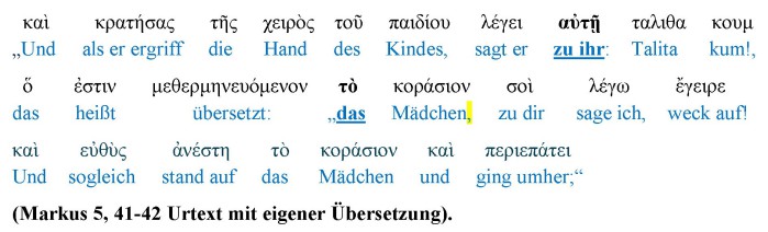 Dieses Zitat bezieht sich auf die Zeit des Menschen Jesus und die Auferstehung eines kleinen Mädchens. Nach den Lehren des Weltreligionssystems wird das kleine Mädchen vom Menschen Jesus auferweckt. Wenn man jedoch den Urtext der Bibel sorgfältig liest, kann man sehen, dass Jesus nur als Gefäß für Gottes Sohn diente. In diesem Vers wird zuerst das aramäische Wort „Talita, kumi“ übersetzt, das in diesem Fall mit dem bestimmten Artikel „das kleine Mädchen“ interpretiert wird. Das gleiche Wort dient weiterhin als Verbindung zur Geschichte des Ereignisses. Die Betrüger des Weltreligionssystems entfernen aus ihren Übersetzungen den bestimmten Artikel „das“ zum Wort „kleines Mädchen“. So, dass es scheint, dass der Mensch Jesus das kleine Mädchen anspricht, und dass der Mensch Jesus derjenige ist, der das Wunder begeht. In Wirklichkeit spricht der Mensch Jesus jedoch sein Leben an, das der Sohn Gottes ist, und fordert es auf, das kleine Mädchen wiederzubeleben. Diese Tatsache wird durch das feminine Pronomen αὐτῇ (avthi = „zu ihr“) verstärkt. Das heißt, wenn der Mensch Jesu tatsächlich das Mädchen ansprach, dann müsste der Urtext das neutrale Pronomen αὐτῷ (avtho = „zu ihm“) stehen haben. Weil die Wörter "Mädchen" und "Kind" auch neutral sind. Das Wunder wurde also vom Sohn Gottes vollbracht, weil er das Leben selbst ist. Denn das Wort „Leben“ auf Griechisch ist ein feminines Wort. Also sprach der Mensch Jesus das Leben an, das in ihm war, und das Leben vollbrachte das Wunder. Außerdem wird ja in Matthäus 12, 28 bestätigt, dass nicht der Mensch Jesus die Wunder vollbrachte, sondern der Geist Gottes, nämlich, der Sohn Gottes. Das folgende Zitat hat Ähnlichkeit mit dem vorliegenden, da das folgende übersetzte Wort "Christus" auch als Verbindung des Ereignisses dienen sollte: