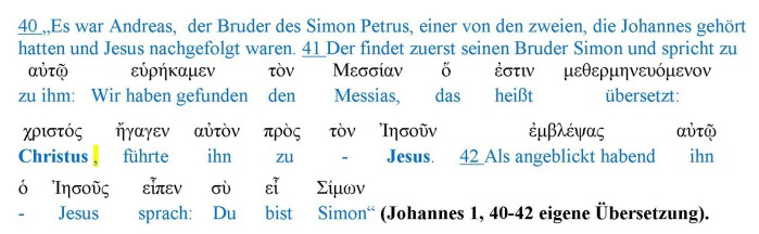Liebe Leserinnen und Leser, es sei darauf hingewiesen, dass die Originaltexte der Bibel in Großbuchstaben, ohne Betonung, ohne Interpunktion und ohne Versnummern verfasst wurden. Diejenigen, die den Platz Christi einnahmen (= Antichristen), waren die, die davon profitierten. Das heißt, das religiöse System setzt in Vers 1, 41 des Johannes Evangeliums nach dem Wort „Christus“ das Interpunktionszeichen und dann die Nummer des Verses, um die Unterscheidung zwischen dem Sohn Gottes und dem Menschen Jesus zu verdecken. Mit dieser Willkür wollen sie überzeugen, dass der Andreas derjenige sei, der seinen Bruder Simon zu Jesus geführt hat. Die Bibel bestätigt jedoch, dass Andreas seinen Bruder Simon nicht zu Jesus geführt haben kann, sondern der Sohn Gottes hat ihn zu Jesus geführt. Ausführliche beweise dazu stehen im Thema „Der Name meines Vaters“.