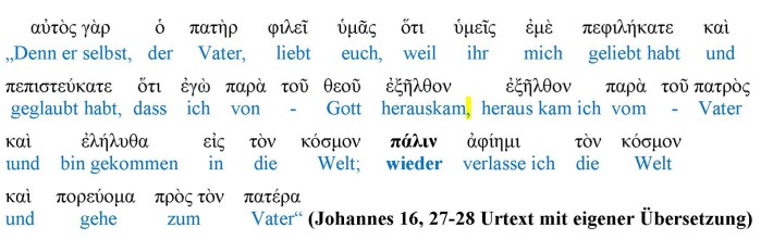 Dieses Zitat spiegelt genau das wieder, was in Genesis 1, 4 erwähnt wird. Dass aus Gott, das Licht kam und aus dem Licht kam der Tag. Im vorhergehenden Fall kam der Sohn Jesus aus dem Vater und aus dem Sohn seine andere Hälfte, Christus. Damit dieses Geheimnis nicht enthüllt werde, setzt das religiöse System das Interpunktionszeichen und die Versnummer zwischen die beiden „ich bin herausgekommen“. Beachten Sie auch das Adverb „wieder“, das frühere Abfahrten des Sohnes von der Welt andeutet, auf die im sogenannten Alten Testament Bezug genommen wird.