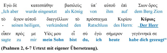 Aus dem Hebräerbrief 5, 5 schließen wir, dass der Sprecher in den vorliegenden Psalm der Christus ist, der als König eingesetzt wird (vgl. Offenbarung 11, 15). Beachten Sie jedoch, dass nicht nur der Sprecher, der als König eingesetzt wurde, als Sohn Gottes bestätigt wird, sondern auch der Herr. Dies liegt daran, dass der Sprecher den Ratschluss des Herrn zitiert. Dies beweist den Dualismus des Sohnes Gottes, der der Sprecher und der Herr des Ratschlusses ist. Diese Bedeutung ist im hebräischen Text nicht erkennbar, da das Judentum einen der beiden Namen „Herr“ aus dem hebräischen Text entfernt hat, um zu verbergen, dass der Sprecher den Herrn zitiert (= wörtliche Wiederholung eines Textes).