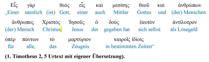 Das religiöse System fügt in seinen Übersetzungen willkürlich das Adverb „zwischen Gott und den Menschen“ hinzu. Es übersetzt auch die zukünftigen „bestimmten Zeiten“ in den Singular, um den Sinn in die Vergangenheit zurückzuführen, indem es willkürlich verschiedene Wörter noch hinzufügt. Das religiöse System will unbedingt davon überzeugen, dass alles erklärt wurde und kein Zeugnis mehr erwartet wird, außer dem Ende der Welt. Der Apostel Paulus versichert uns, dass es einen Gott gibt, aber der Mittler ist nicht nur ein Mittler der zwischen Gott und den Menschen vermittelt, sondern auch zwischen Gott und Gott. In Galaterbrief 3, 20 wird der Dualismus bestätigt, sagend: „Der Mittler aber ist nicht von einem, Gott aber ist einer“. Das heißt, Christus ist der Mittler zwischen den Sohn Gottes und den Menschen, und seine andere Hälfte, Jesus, den Sohn Gottes, vermittelt zwischen Gott und Christus. Es ist schwer zu verstehen werden Sie sagen, liebe Leser, aber wenn es nicht währe, welche Art von Zeugnis würden wir gegenwärtig in den vorbestimmten Zeiten geben?