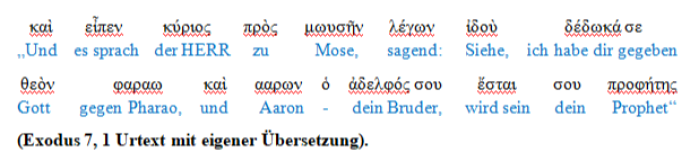 Um die Unterscheidung zwischen den Herrn und Gott zu verdecken, erklärt das religiöse System Mose als Gott an, und übersetzt: „Ich habe dich zum Gott des Pharao gemacht“. In Wirklichkeit jedoch, den Gott, den der Herr an Mose als Unterstützer gab, ist kein anderer als der Sohn des Herrn. Ich möchte glauben, dass sogar Grundschulkindern auffallen sollte, ob in diesem Vers „Ich habe dich gemacht“ oder „Ich habe dir gegeben“ steht. Das Neue Testament erklärt, wer dieser Gott war, der an Mose gegeben wurde: