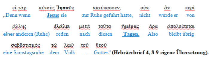 Hier interpretiert nicht nur das religiöse System falsch, sondern fälscht auch zwei Personen in diesem Vers hinein, indem es Gott und Josua den Sohn Nuns hinzufügt. Damit Josua der Sohn Nuns gemeint ist, und dass es sich um das Land der Verheißung handelt. Obwohl „Gott“ und der Name „Josua“ in keinem Urtext stehen, werden sie dennoch willkürlich zu den Übersetzungen hinzugefügt. Dieser Vers bezieht sich auf Gottes himmlische Ruhe! Dies wird im gesamten vierten Kapitel des Hebräerbriefs bestätigt. Hier nun der Beweis. In 2. Mose 33, 14 steht Gottes Äußerung: „Ich werde vorrangehen und dich zu Ruhe führen“. Ich wiederhole, er selbst sagte, dass er sie zu Ruhe führen wird, was er auch tat, denn Josua des Nuns hat dies auch in seinem Buch 1, 13 bestätigt: „Der Herr, dein Gott, hat dich zu Ruhe geführt und dir dieses Land gegeben“! Es steht er hat sie zu Ruhe geführt! Wie Sie sehen können, liebe Leser, wenn das verheißene Land als Ruhe gemeint wäre, wieso steht hier im Hebräerbrief 4, 8 er hat sie nicht zu Ruhe geführt, aber in Josuas Buch 1, 13, hat er sie doch zu Ruhe geführt. Daher kann der Hebräerbrief 4, 8 die himmlische Ruhe Gottes meinen. Und derjenige, der in diesem Vers als Jesus bezeichnet wird, ist der Sohn Gottes, der den gleichen Namen trägt wie der Mensch Jesus. Der Sohn Gottes ist derjenige, der an Mose gegeben wurde, um dem Volk voranzugehen (vgl. Exodus 7, 1). Der Sohn Gottes ist es, der sein Volk in die himmlische Ruhe seines Vaters bringen wird. Außerdem zeigt sich die Personifikation des Tages, die die andere Hälfte des Sohnes Gottes ist (vgl. Genesis 1, 4).